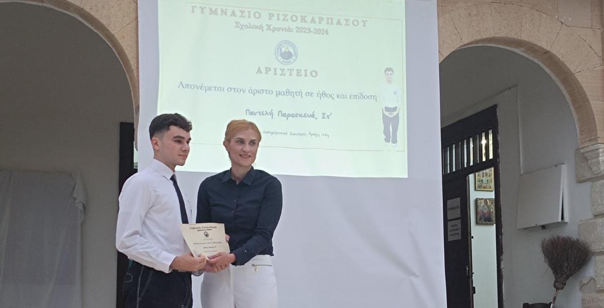 Στην τελική εορτή των Σχολείων του Ριζοκαρπάσου παρευρέθηκε, εκ μέρους του Προέδρου της Δημοκρατίας κ. Νίκου Χριστοδουλίδη, η Επικεφαλής Ανθρωπιστικών Θεμάτων Αγνοουμένων και Εγκλωβισμένων κα Άννα Αριστοτέλους, η οποία έστειλε μηνύματα στήριξης στα παιδιά, τονίζοντας ότι στόχος είναι η διασφάλιση ίσων ευκαιριών στην εκπαίδευση. Στο πλαίσιο της εκδήλωσης η κ. Αριστοτέλους απένειμε, εκ μέρους του Προέδρου της Δημοκρατίας, χρηματικά βραβεία στους τελειόφοιτους μαθητές του Γυμνασίου και Δημοτικού και στους αριστεύσαντες μαθητές των Σχολείων Ριζοκαρπάσου.