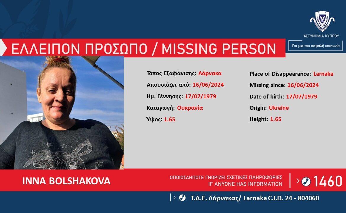 Η Αστυνομία ζητά πληροφορίες που μπορούν να βοηθήσουν στον εντοπισμό της INNA BOLSHAKOVA, 45 ετών, από την Ουκρανία, η οποία απουσιάζει από την οικία της στη Λάρνακα, από τις 16/06/2024.
