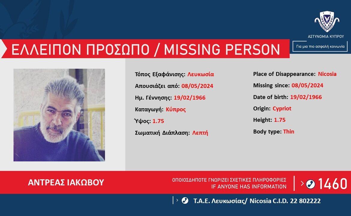 Η Αστυνομία ζητά πληροφορίες που μπορούν να βοηθήσουν στον εντοπισμό του ΑΝΤΡΕΑ ΙΑΚΩΒΟΥ, 58 ετών, ο οποίος απουσιάζει από την οικία του στη Λακατάμια.