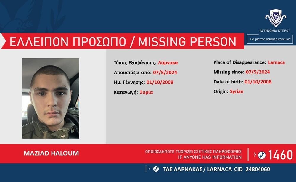 Η Αστυνομία ζητά πληροφορίες που μπορούν να βοηθήσουν στον εντοπισμό του MAZIAD HALLΟUM, 16 ετών, από τη Συρία, ο οποίος απουσιάζει από τον χώρο διαμονής του στη Λάρνακα.
