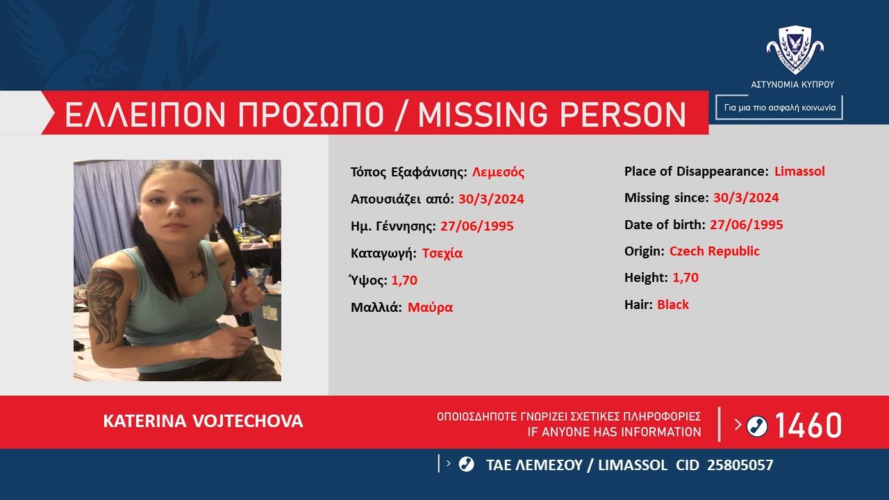 Η Αστυνομία ζητά πληροφορίες, που μπορούν να βοηθήσουν στον εντοπισμό της KATERINA VOJTECHOVA, 29 ετών, από τη Τσεχία, η οποία απουσιάζει από την οικία της, στη Λεμεσό, από τις 30 Μαρτίου 2024.