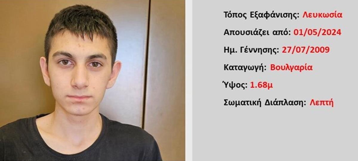 Η Αστυνομία ζητά πληροφορίες που μπορούν να βοηθήσουν στον εντοπισμό του Emiliyan Yordanov, 14 ετών, από τη Βουλγαρία, ο οποίος απουσιάζει από την 1η Μαΐου 2024, από τον χώρο διαμονής του στη Λευκωσία.
