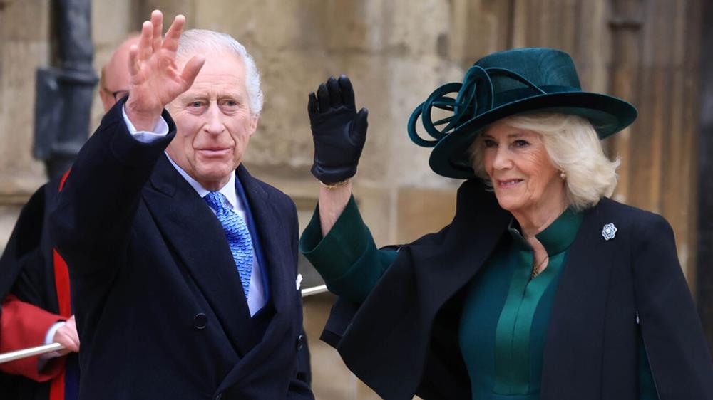 Φορώντας σκούρο παλτό και μπλε γραβάτα, ο βασιλιάς ευχήθηκε Καλό Πάσχα καθώς στεκόταν δίπλα στην Καμίλα έξω από το παρεκκλήσι του Αγίου Γεωργίου.