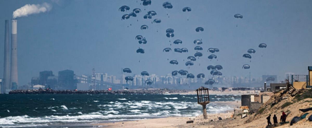 Στρατιωτικά αεροσκάφη ρίχνουν παλέτες με ανθρωπιστική βοήθεια εδώ και αρκετές εβδομάδες, με τη στήριξη χωρών όπως το Ηνωμένο Βασίλειο, η Γαλλία, οι ΗΠΑ, η Αίγυπτος και η Ιορδανία.