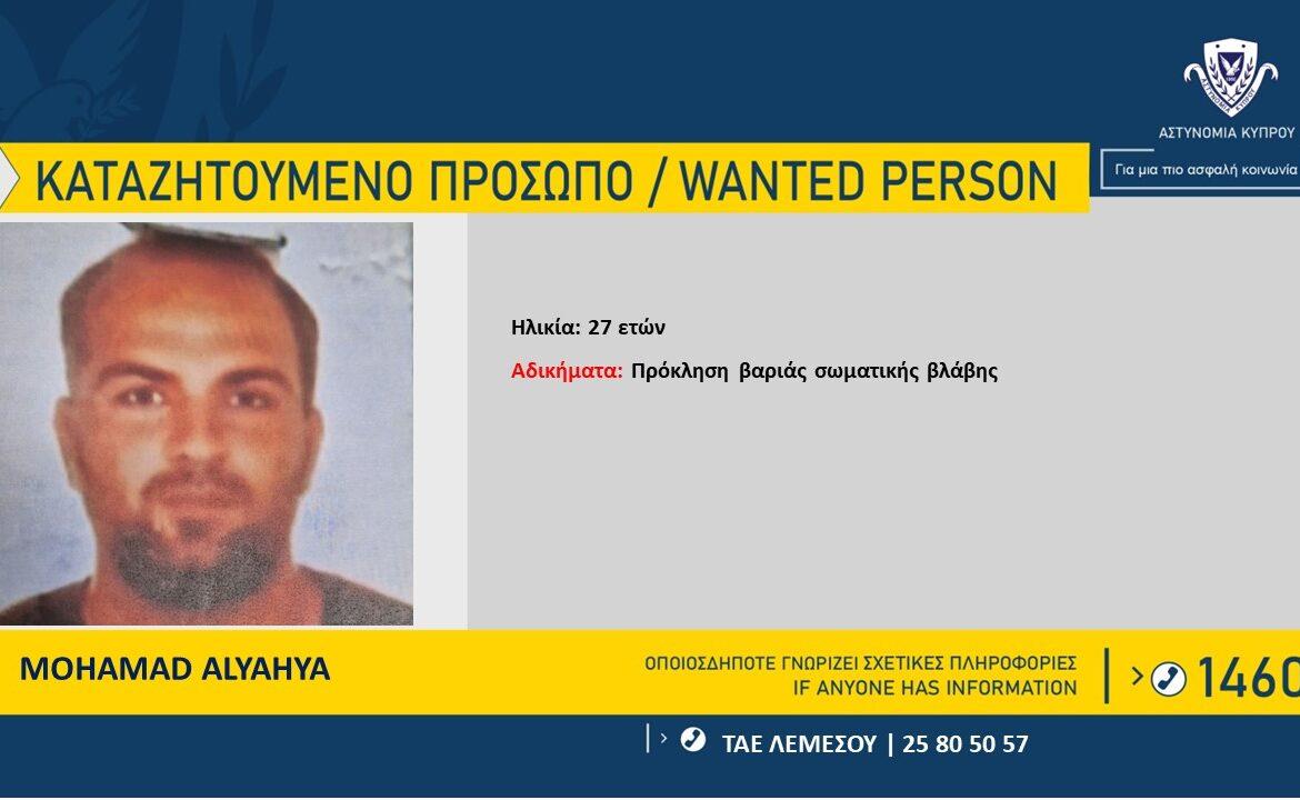 Η Αστυνομία ζητά πληροφορίες, που μπορούν να βοηθήσουν στον εντοπισμό του MOHAMAD ALYAHYA, 27 ετών από τη Συρία για διευκόλυνση των ανακρίσεων, σε σχέση με υπόθεση που αφορά το αδίκημα της πρόκλησης βαριάς σωματικής βλάβης, το οποίο διαπράχθηκε στις 06/02/2024 στη Λεμεσό.