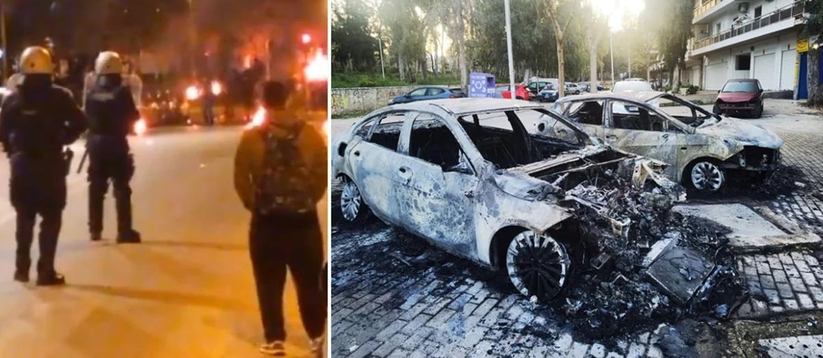 Λίγο μετά τη 1, μια ομάδα περίπου 20 κουκουλοφόρων βγήκαν από το χώρο του Πανεπιστημίου, όπου εκείνη την ώρα υπήρχε ένα πάρτυ, και πυρπόλησαν επτά ΙΧ αυτοκίνητα τα οποία ήταν σταθμευμένα στους γύρω δρόμους.