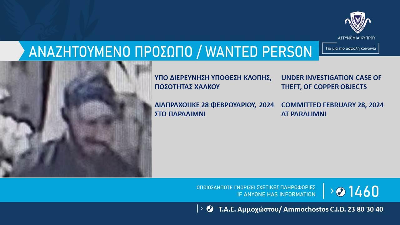 Η Αστυνομία ζητά πληροφορίες, που μπορούν να βοηθήσουν στην αναγνώριση ή τον εντοπισμό, του εικονιζόμενου προσώπου, το οποίο αναζητείται σε σχέση με διερευνώμενη υπόθεση κλοπής, που διαπράχθηκε στην επαρχία Αμμοχώστου.