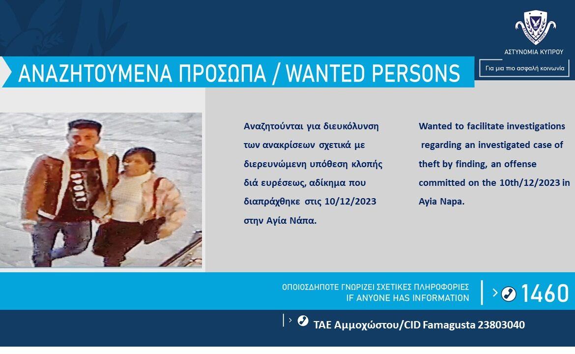 Η Αστυνομία ζητεί πληροφορίες για εντοπισμό δύο προσώπων, οι φωτογραφίες των οποίων δημοσιεύονται, σχετικά με διερευνώμενη υπόθεση κλοπής δια ευρέσεως, αδίκημα που διαπράχθηκε στις 10 Δεκεμβρίου, 2024 στην Αγία Νάπα.