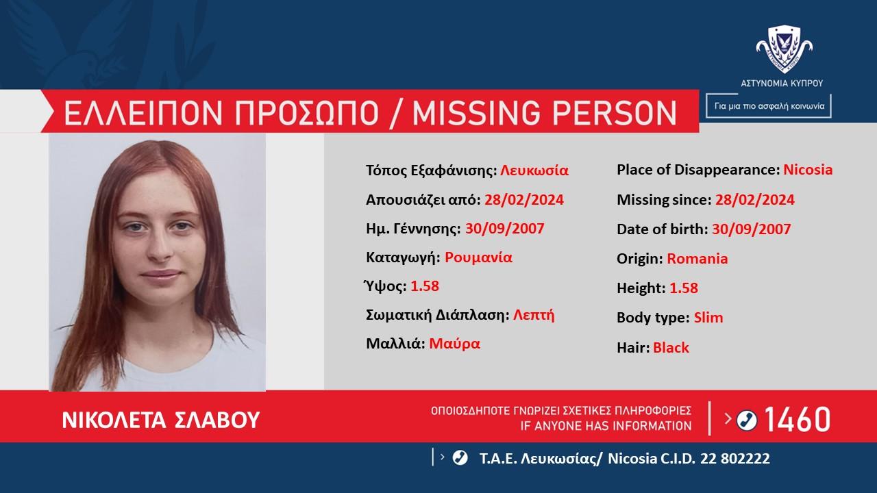 Η Αστυνομία ζητά πληροφορίες, που μπορούν να βοηθήσουν στον εντοπισμό της ΝΚΟΛΕΤΑΣ ΣΛΑΒΟΥ, 16 ετών, από τη Ρουμανία, η οποία απουσιάζει από το χώρο διαμονής της, στη Λευκωσία, από τις 28 Φεβρουαρίου 2024.