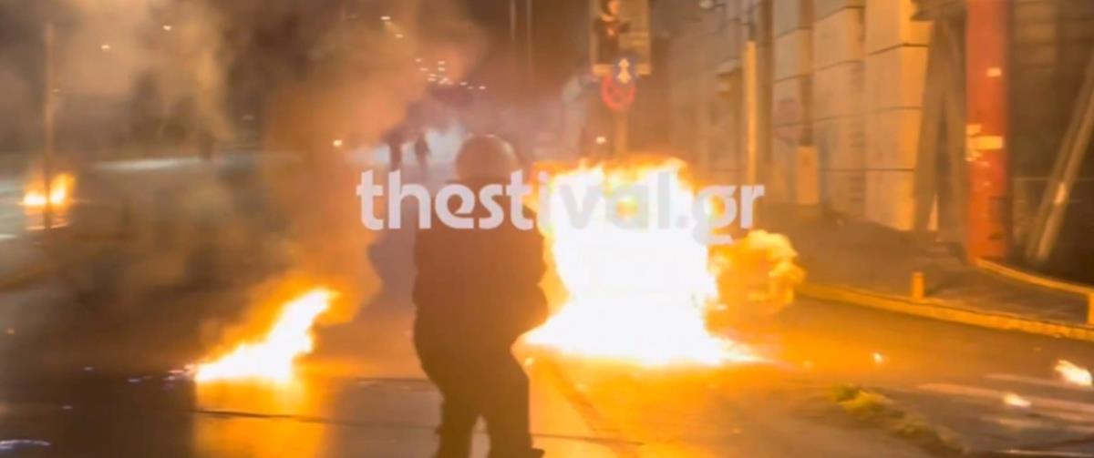 Με ρίψη μολότοφ και άλλων αντικειμένων, κουκουλοφόροι συγκρούστηκαν με αστυνομικές δυνάμεις, λίγο μετά τα μεσάνυχτα, στη συμβολή των οδών Αγίου Δημητρίου και Εθνικής Αμύνης έξω από το Αριστοτέλειο Πανεπιστήμιο Θεσσαλονίκης.