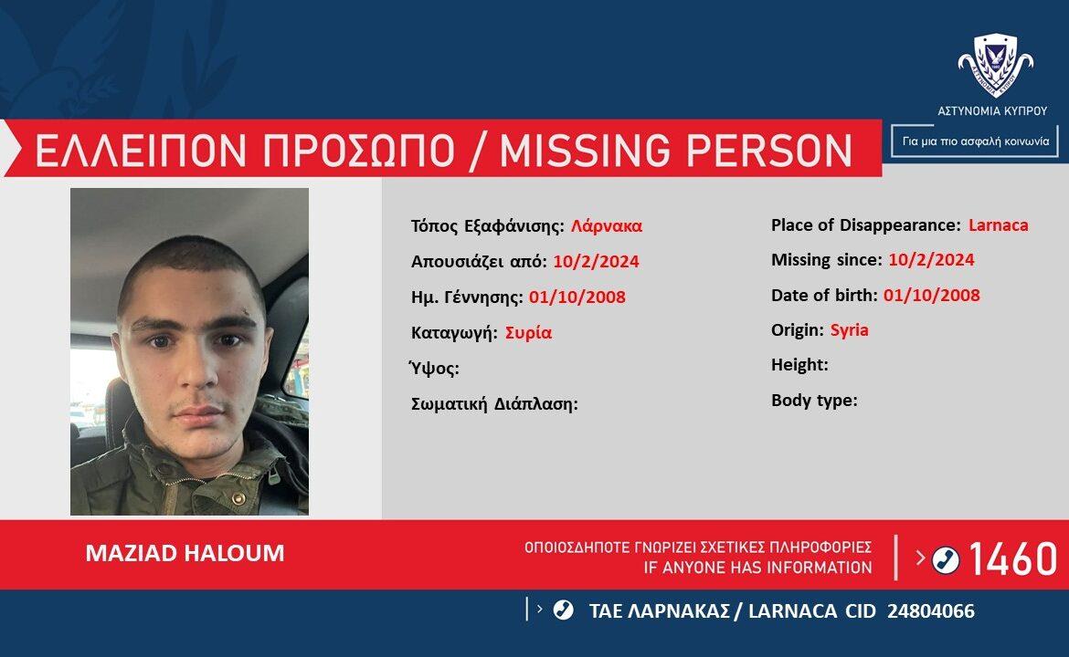 Η Αστυνομία ζητά πληροφορίες που μπορούν να βοηθήσουν στον εντοπισμό του MAZIAD HALLΟUM, 16 ετών, από τη Συρία, ο οποίος απουσιάζει από τον χώρο διαμονής του στη Λάρνακα.