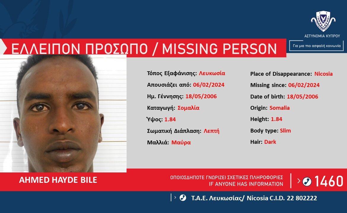 Η Αστυνομία ζητά πληροφορίες που μπορούν να βοηθήσουν στον εντοπισμό του AHMED HAYDE BILE, 17 ετών, από τη Σομαλία, ο οποίος απουσιάζει από τον χώρο διαμονής του στη Λευκωσία, από χθες 06/02/2024.