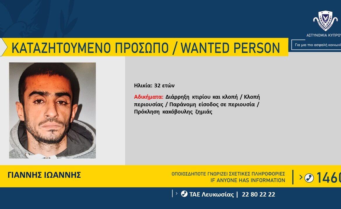 Αστυνομία ζητά πληροφορίες, που μπορούν να βοηθήσουν στον εντοπισμό του Γιάννη Ιωάννου, 32 ετών, για διευκόλυνση των ανακρίσεων, σε σχέση με υπόθεση που αφορά τα αδικήματα της διάρρηξης κτηρίου και κλοπής, κλοπής περιουσίας, παράνομης εισόδου σε περιουσία και πρόκλησης κακόβουλης ζημιάς, αδικήματα τα οποία διαπράχθηκαν μεταξύ Οκτωβρίου 2023 και Φεβρουαρίου 2024.