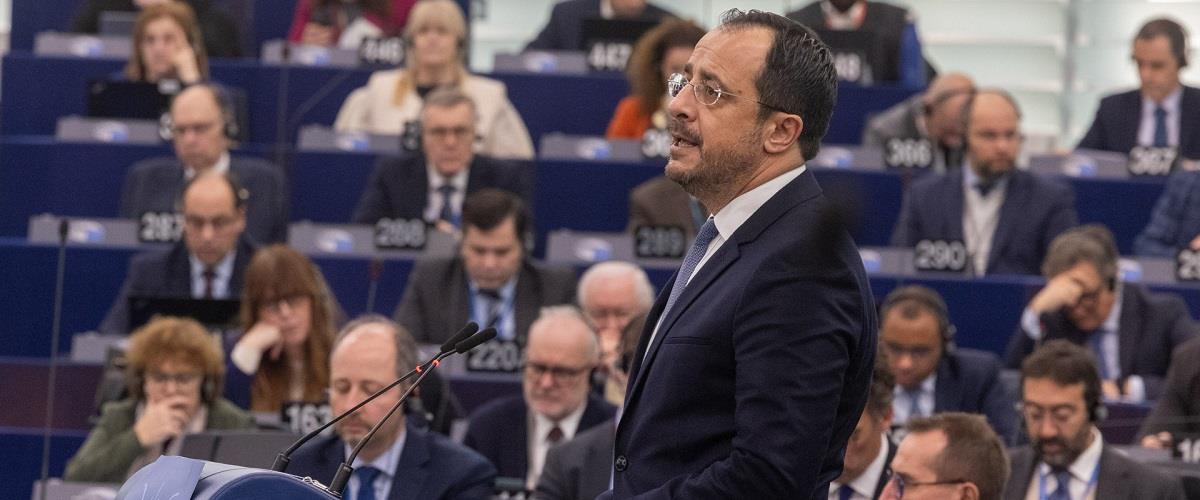 Στην ομιλία που πραγματοποιήθηκε την Τρίτη στο Στρασβούργο, στην αίθουσα της ολομέλειας του Ευρωπαϊκού Κοινοβουλίου λόγω του ότι η αίθουσα του ΣτΕ βρίσκεται υπό ανακαίνιση, ο Πρόεδρος Χριστοδουλίδης υπενθύμισε πως «το κενό που δημιουργείται από την απουσία βιώσιμης, διαρκούς ειρήνης γίνεται πρόσφορο έδαφος για κρίσεις» κάτι το οποίο είναι καλά γνωστό στην Κύπρο, όπου τα ανθρώπινα δικαιώματα «παραμένουν, δυστυχώς, μια ανεκπλήρωτη υπόσχεση για όλους τους Κύπριους, ως αποτέλεσμα της παράνομης εισβολής της Τουρκίας το 1974 και της συνεχιζόμενης κατοχής».
