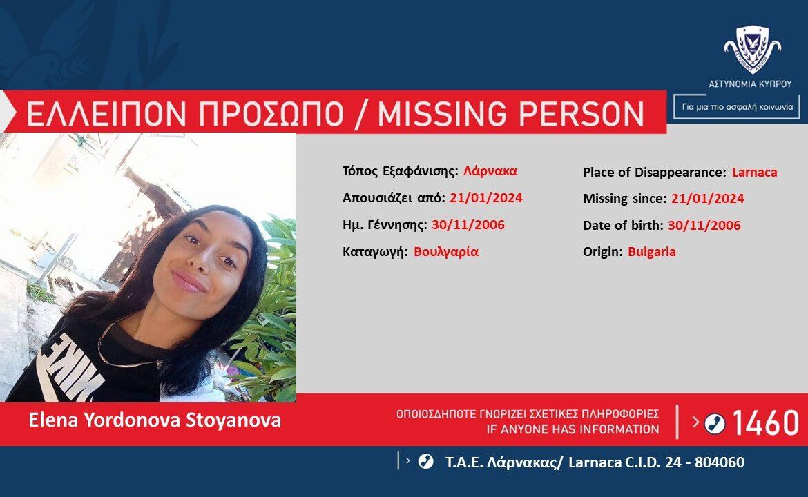 Η Αστυνομία ζητά πληροφορίες που μπορούν να βοηθήσουν στον εντοπισμό της ELENA YORDONOVA STOYANOVA, 17 ετών, από τη Βουλγαρία, η οποία απουσιάζει από την οικία της στη Λάρνακα, από χθες 21/01/2024.