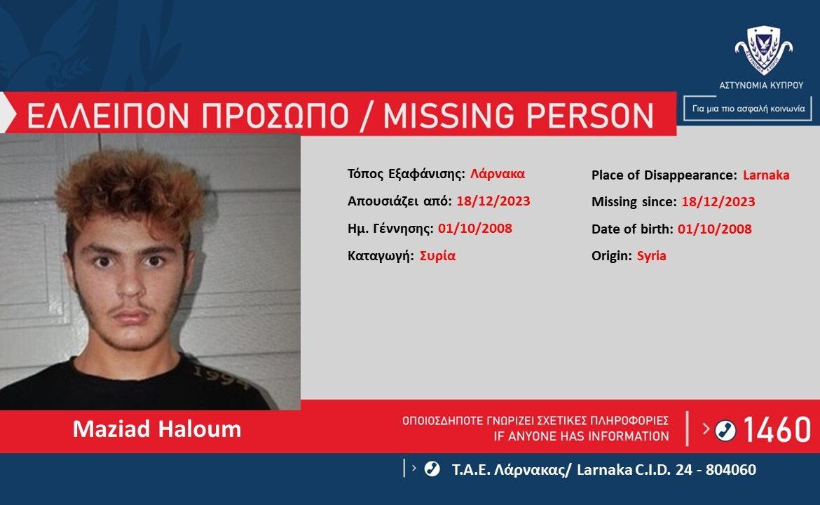 Η Αστυνομία ζητά πληροφορίες που μπορούν να βοηθήσουν στον εντοπισμό του MAZIAD HALΟUM, 15 ετών, από τη Συρία, ο οποίος απουσιάζει από τον χώρο διαμονής του στη Λάρνακα, από χθες 18/12/2023.