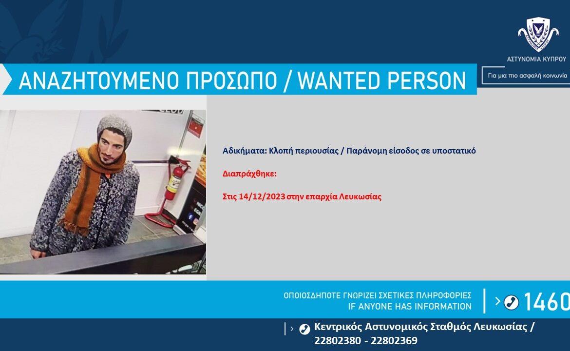 Η Αστυνομία ζητά πληροφορίες, που μπορούν να βοηθήσουν στην αναγνώριση ή τον εντοπισμό του εικονιζόμενου προσώπου, το οποίο αναζητείται για διευκόλυνση των ανακρίσεων, σχετικά με διερευνώμενη υπόθεση κλοπής περιουσίας και παράνομης εισόδου σε υποστατικό, αδικήματα που διαπράχθηκαν στις 14/12/2023 στην επαρχία Λευκωσίας.