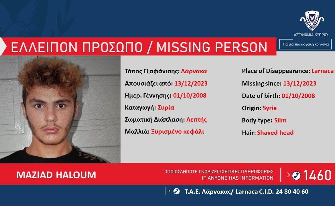 Πρόκειται για τον Maziad Haloum, ημερομηνία γέννησης 01/10/2008, από Συρία, ο οποίος ελλείπει από τον χώρο διαμονής του από τη 1.00 το μεσημέρι, της Τετάρτης, 13 Δεκεμβρίου, 2023.