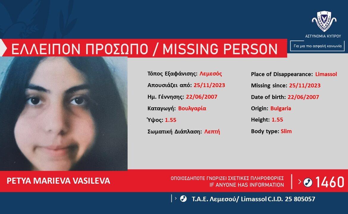 Πρόκειται για τον PETYA MARIEVA VASILEVA, 16 ετών, από τη Βουλγαρία, η οποία ελλείπει από τον χώρο διαμονής της, στη Λεμεσό, από χθες 25/11/2023, το μεσημέρι. Η 16χρονη περιγράφεται ως λεπτής σωματικής διάπλασης, ύψους 1.55μ. περίπου, με καστανά μαλλιά και κατά την αναχώρησή της, φορούσε άσπρο τζιν, άσπρα αθλητικά και μαύρη φανέλα.