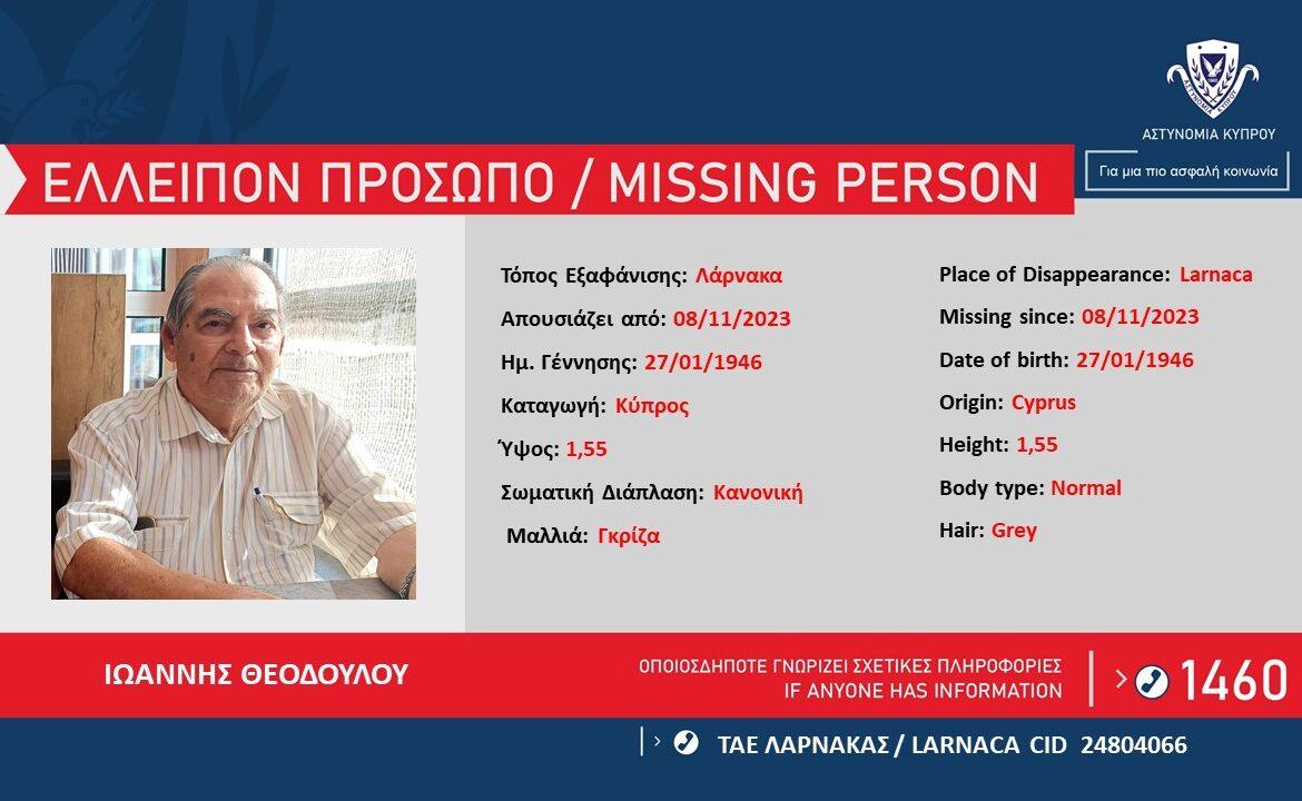 Η Αστυνομία ζητά πληροφορίες που μπορούν να βοηθήσουν στον εντοπισμό του ΙΩΑΝΝΗ ΘΕΟΔΟΥΛΟΥ, 77 ετών, από την Λάρνακα, ο οποίος απουσιάζει από την οικία του στην Λάρνακα, από η ώρα 2.30μ.μ. σήμερα.
