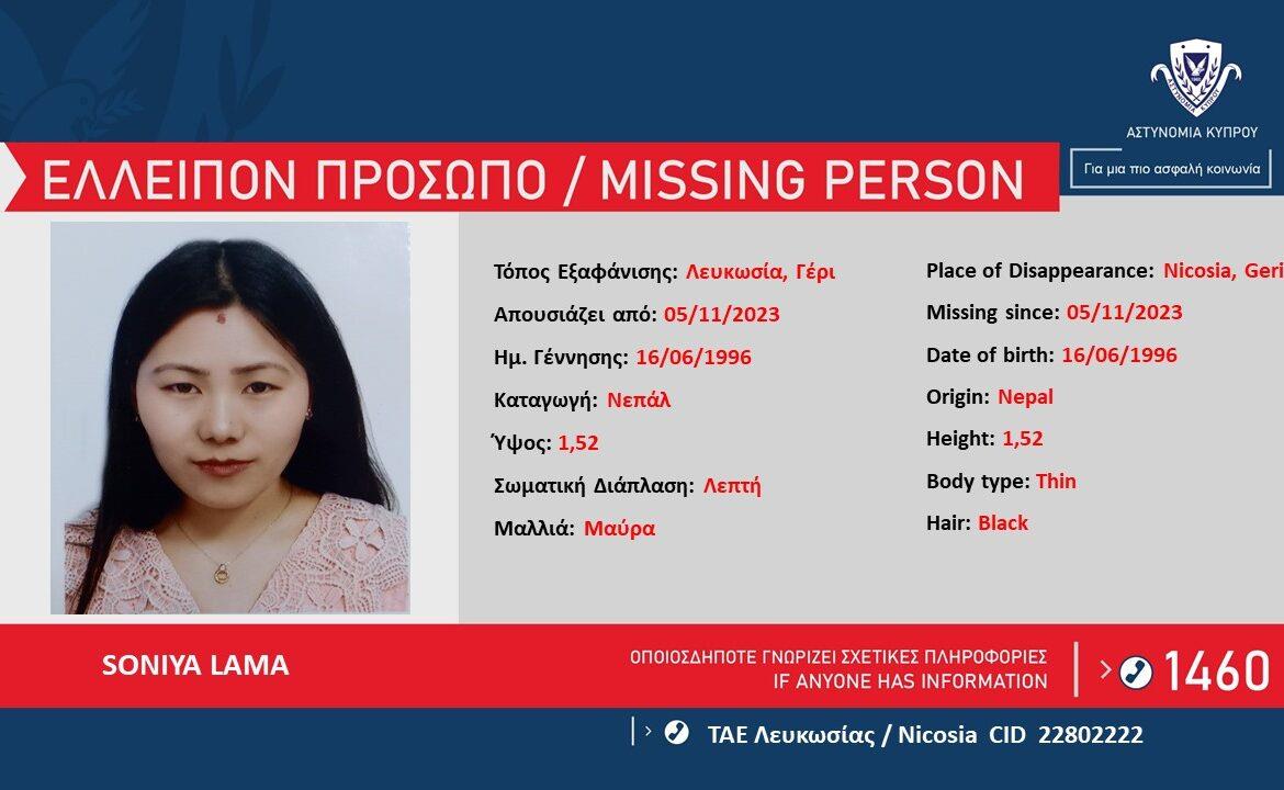 Η Αστυνομία ζητά πληροφορίες για εντοπισμό της SONIYA LAMA, 27 ετών από το Νεπάλ, η οποία απουσιάζει από το χώρο διαμονής της στη Λευκωσία, Γέρι, από τις 5/11/2023.