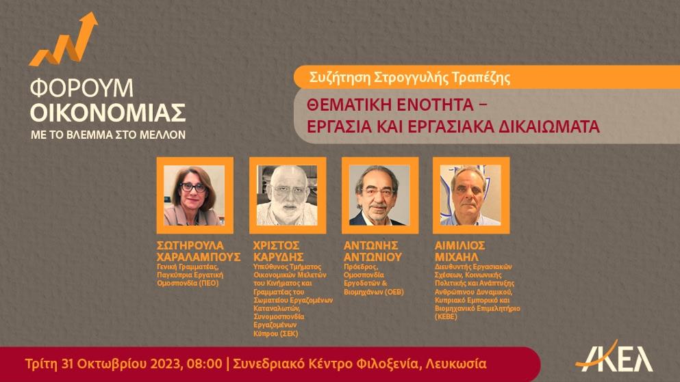 Σε πάνελ που φιλοξενεί το Φόρουμ θα συζητηθούν τα πιο πάνω με πρωταγωνιστές να παίρνουν θέσεις και να εκφράζουν απόψεις. Πρόκειται για τους Σωτηρούλα Χαραλάμπους, Γενική Γραμματέα της ΠΕΟ, Χρίστο Καρύδη, Υπεύθυνο Τμήματος Οικονομικών Μελετών του Κινήματος και Γραμματέα του Σωματείου Εργαζομένων Καταναλωτών, ΣΕΚ, Αντώνη Αντωνίου, Πρόεδρο της ΟΕΒ και Αιμίλιο Μιχαήλ Διευθυντή Εργασιακών Σχέσεων, Κοινωνικής Πολιτικής και Ανάπτυξης Ανθρώπινου Δυναμικού του ΚΕΒΕ.