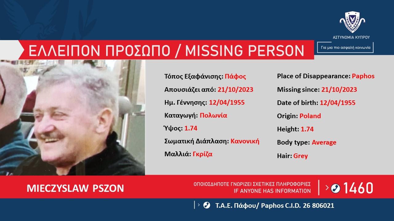 Η Αστυνομία ζητά πληροφορίες που μπορούν να βοηθήσουν στον εντοπισμό του Mieczyslaw Pszon, 68 ετών, από την Πολωνία, ο οποίος ελλείπει από το χώρο διαμονής του, στην Χλώρακα, από τις 6μ.μ., της 21 ης Οκτωβρίου 2023.