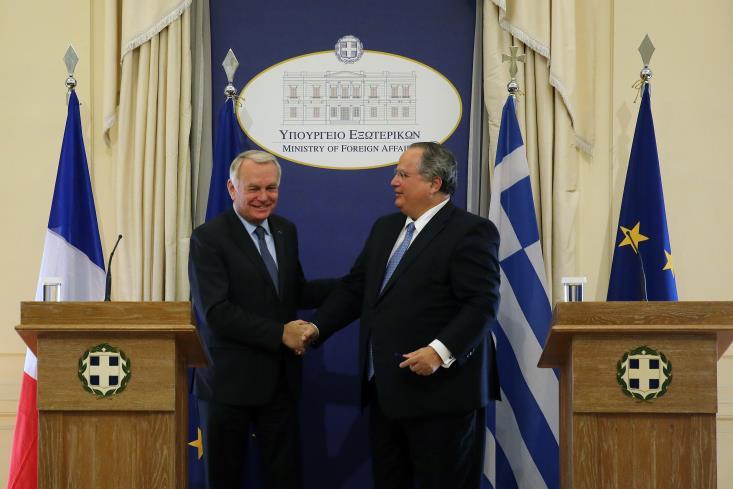 Το Κυπριακό συζητήθηκε αναλυτικά κατά τη συνάντηση που είχαν ο Έλληνας Υπουργός Εξωτερικών Νίκος Κοτζιάς με τον Γάλλο ομόλογό του Ζαν Μαρκ Ερό στην Αθήνα, οι οποίοι αντάλλαξαν εκτενώς απόψεις επίσης για την προσφυγική κρίση, τη συμφωνία ΕΕ - Τουρκίας για το συγκεκριμένο θέμα, τις εξελίξεις στην ευρύτερη περιοχή της Μέσης Ανατολής αλλά και για το θέμα του ελληνικού χρέους και την πορεία της δεύτερης αξιολόγησης.