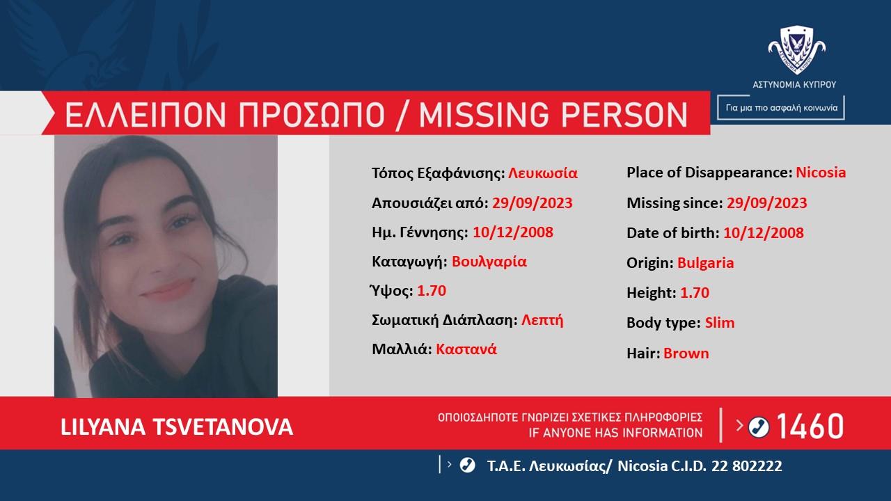Η Αστυνομία ζητά πληροφορίες που μπορούν να βοηθήσουν στον εντοπισμό της LILYANA TSVETANOVA, 15 ετών, από την Βουλγαρία, η οποία απουσιάζει από το χώρο διαμονής της, στη Λευκωσία, από το βράδυ της 28ης Σεπτεμβρίου 2023.