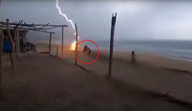 Βίντεο που κυκλοφόρησε στο διαδίκτυο δείχνει τη στιγμή που ένας κεραυνός 'χτυπά' στην παραλία της πόλης Μιτσοακάν, και ρίχνει στην άμμο μία γυναίκα, ενώ στη συνέχεια χτυπά ένα ακόμα άτομο, ο οποίος έτρεχε τρομαγμένος να σωθεί.