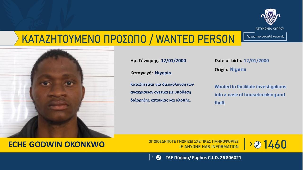 Η Αστυνομία ζητεί πληροφορίες για εντοπισμό του ECHE GODWIN OKONKWO, ηλικίας 23 ετών, από τη Νιγηρία, η φωτογραφία του οποίου δημοσιεύεται, σχετικά με διερευνώμενη υπόθεση διάρρηξης κατοικίας και κλοπής, που διαπράχθηκε στις 15 Ιουλίου, 2023 στη Χλώρακα.