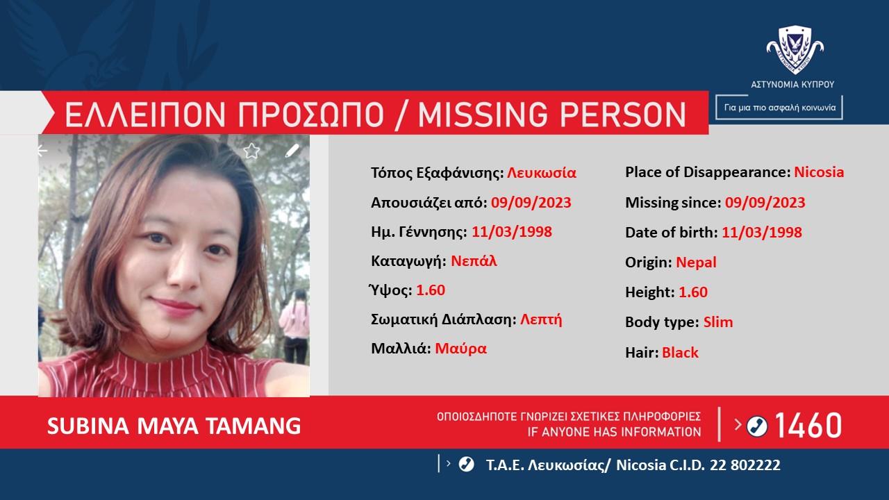 Η Αστυνομία ζητά πληροφορίες που μπορούν να βοηθήσουν στον εντοπισμό της SUBINA MAYA TAMANG, 25 ετών, από το Νεπάλ, η οποία απουσιάζει από το χώρο διαμονής της, στο Μιτσερό, της επαρχίας Λευκωσίας, από τις 9 Σεπτεμβρίου 2023.