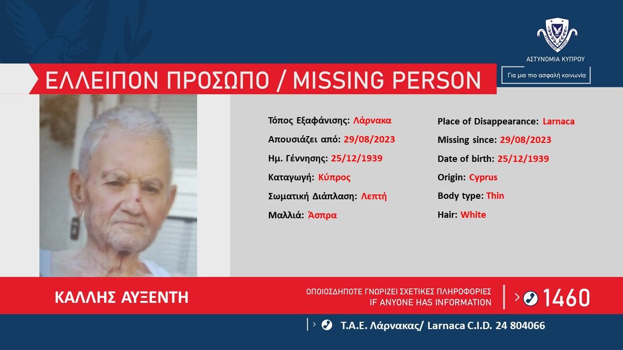 Η Αστυνομία ζητά πληροφορίες για εντοπισμό του ΚΑΛΛΗ ΑΥΞΕΝΤΗ, 83 ετών από τη Λάρνακα, ο οποίος απουσιάζει από την οικία του από σήμερα το απόγευμα.