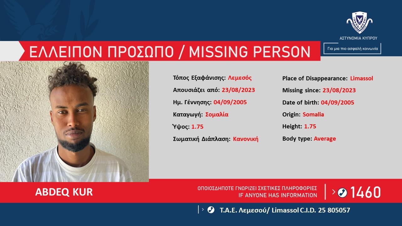 Η Αστυνομία ζητά πληροφορίες που μπορούν να βοηθήσουν στον εντοπισμό του ABDEQ KUR, 18 ετών, από τη Σομαλία, ο οποίος απουσιάζει από τις 23 Αυγούστου 2023, από τον χώρο διαμονής του στη Λεμεσό.