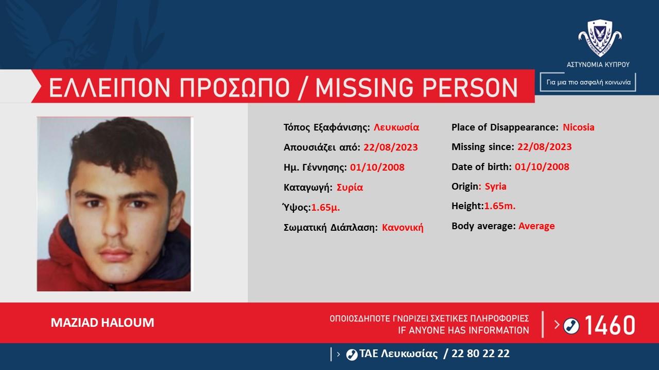 Η Αστυνομία ζητά πληροφορίες που μπορούν να βοηθήσουν στον εντοπισμό του MAZIAD HALOUM, 14 ετών, από τη Συρία, ο οποίος απουσιάζει από τις 22 Αυγούστου 2023, από τον χώρο διαμονής της στη Λευκωσία.