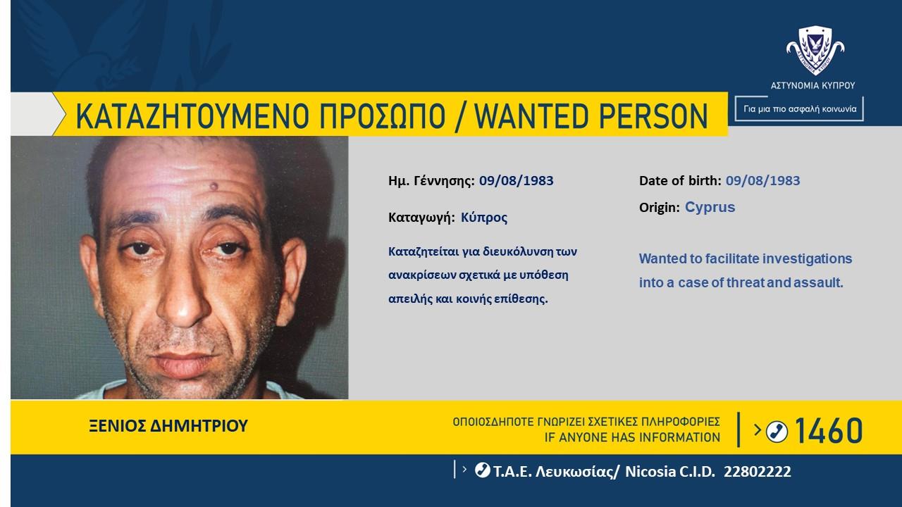 Η Αστυνομία ζητά πληροφορίες που μπορούν να βοηθήσουν στον εντοπισμό του Ξένιου Δημητρίου, 39 ετών, εναντίον του οποίου εκκρεμεί δικαστικό ένταλμα σύλληψης, για διευκόλυνση των ανακρίσεων σχετικά με διερευνώμενη υπόθεση απειλής, απαίτησης περιουσίας με απειλές και κοινής επίθεσης, που διαπράχθηκε στην επαρχία Λευκωσίας, στις 26/07/2023.