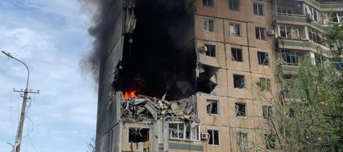 Σε ένa βίντεο που ανήρτησε ο Ουκρανός Πρόεδρος Βολοντίμιρ Ζελένσκι φαίνεται το κτίριο κατοικιών πολλοί όροφοι του οποίου έχουν καταστραφεί και φωτιά να καίει στο εσωτερικό του. Συντρίμμια βρίσκονται στον δρόμο μπροστά από το κτίριο όπου έχουν σπεύσει πυροσβέστες.