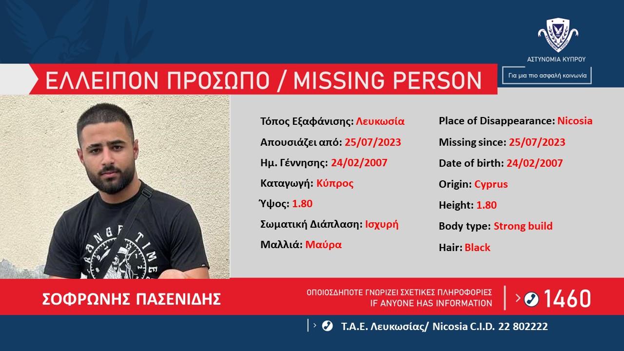 Η Αστυνομία ζητά πληροφορίες, που μπορούν να βοηθήσουν στον εντοπισμό του Σοφρώνη Πασενίδη, 16 ετών, ο οποίος απουσιάζει από την οικία του, στη Λευκωσία, από τις 25 Ιουλίου 2023.