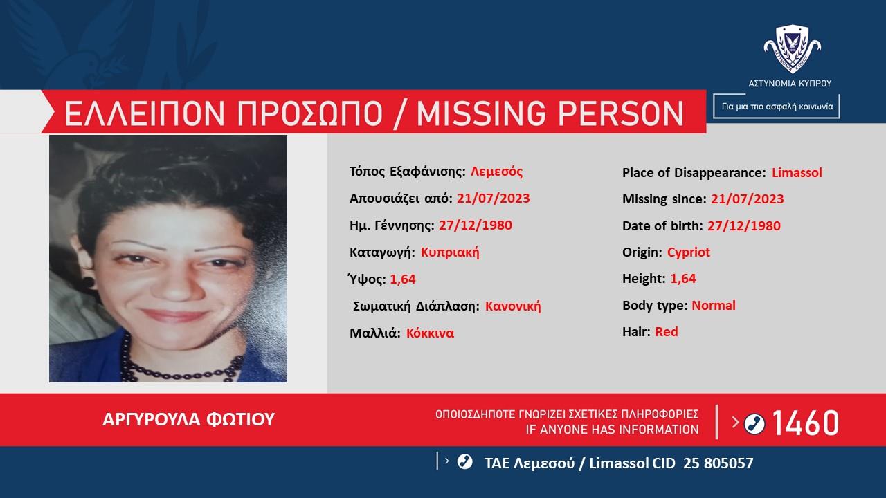 Η Αστυνομία ζητά πληροφορίες που μπορούν να βοηθήσουν στον εντοπισμό της ΑΡΓΥΡΟΥΛΑΣ ΦΩΤΙΟΥ, 43 ετών από τη Λεμεσό, η οποία απουσιάζει από χθες 21/07/2023 από την οικία της στη Λεμεσό.