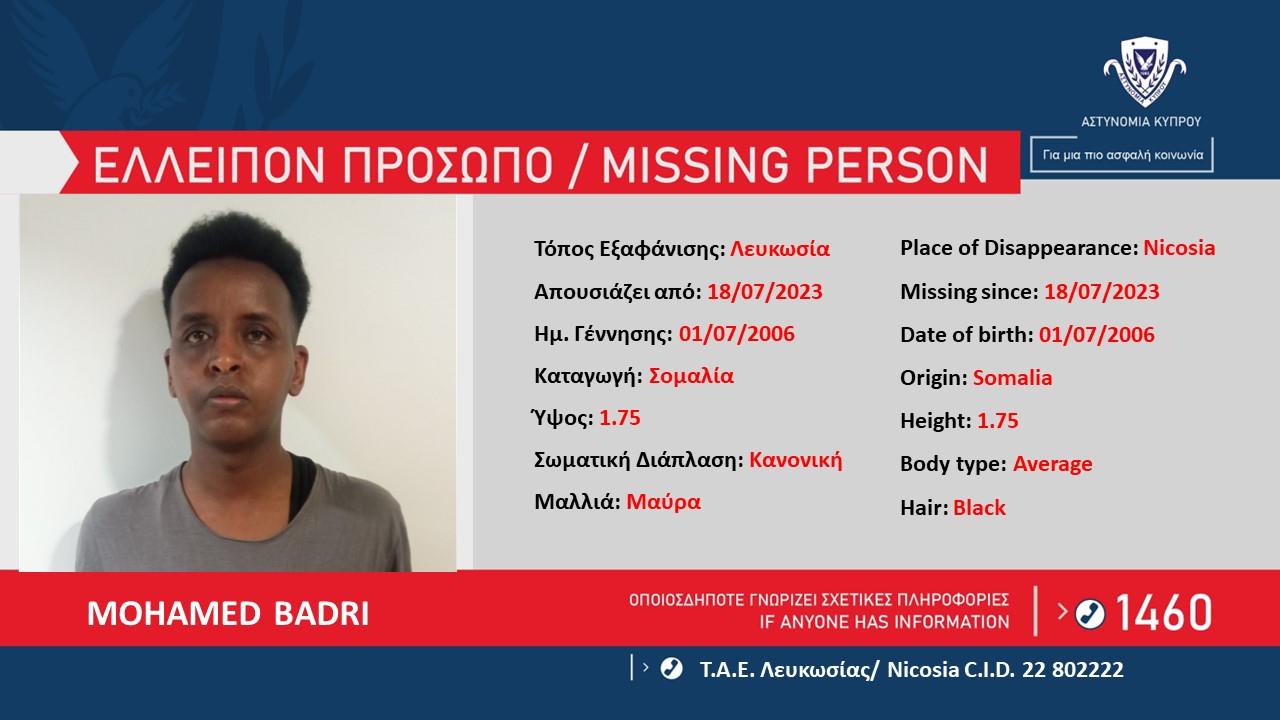 Η Αστυνομία ζητά πληροφορίες που μπορούν να βοηθήσουν στον εντοπισμό του Mohamed Badri, 17 ετών, από τη Σομαλία, ο οποίος απουσιάζει από το χώρο διαμονής του στη Λευκωσία, από τις 18 Ιουλίου 2023.