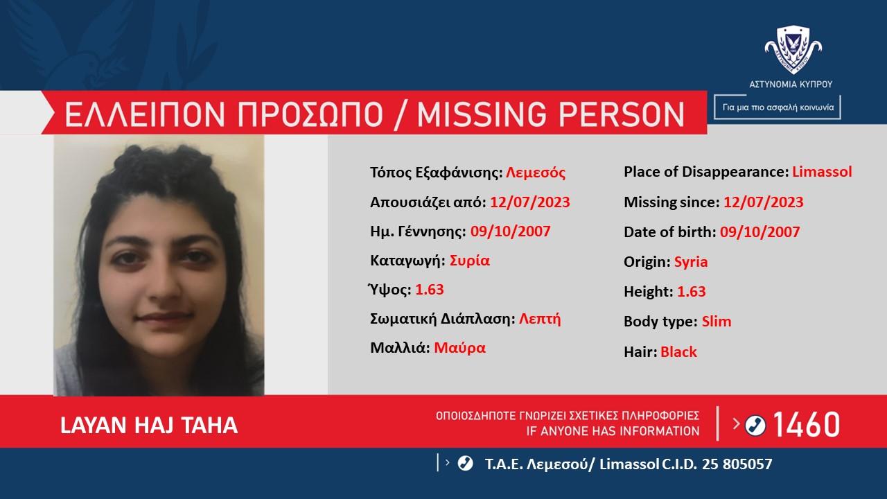 Η Αστυνομία ζητά πληροφορίες που μπορούν να βοηθήσουν στον εντοπισμό της LAYAN HAJ TAHA, 15 ετών, από τη Συρία, η οποία απουσιάζει από το χώρο διαμονής της, στη Λεμεσό, από το απόγευμα της 12ης Ιουλίου 2023.
