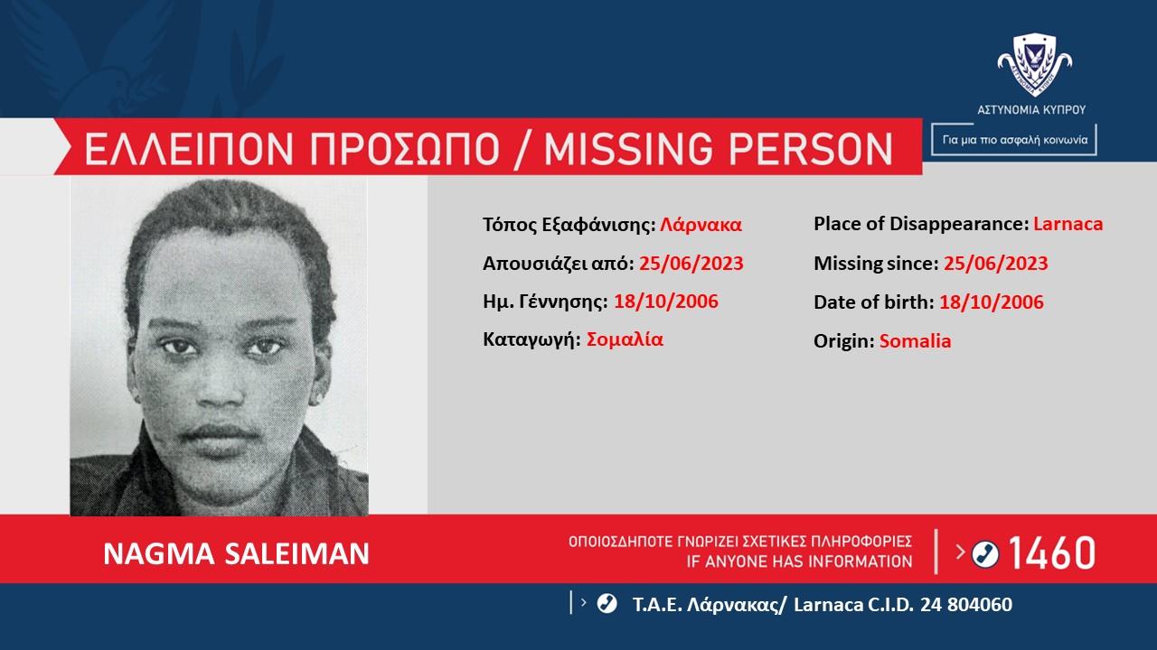Καταγγέλθηκε σήμερα στην Αστυνομία, ότι από τις 25 Ιουνίου 2023, απουσιάζει από το χώρο διαμονής της, στη Λάρνακα, η NAGMA SALEIMAN, 17 ετών, από τη Σομαλία.