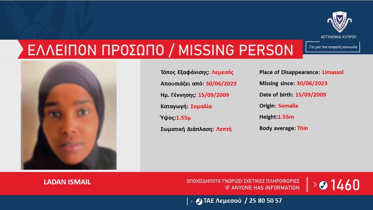 Η Αστυνομία ζητά πληροφορίες που μπορούν να βοηθήσουν στον εντοπισμό της LADAN ISMAIL, 14 ετών, από τη Σομαλία, η οποία απουσιάζει από τις 30/06/2023 από τον χώρο διαμονής της στη Λεμεσό.