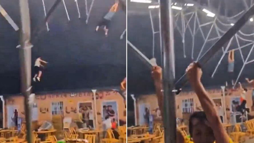 Το ακόμα πιο τρομακτικό, όμως, είναι ότι μαζί με την τέντα, στον αέρα βρέθηκαν και ορισμένοι από τους ανθρώπους που προσπάθησαν - μάταια - να την κρατήσουν.