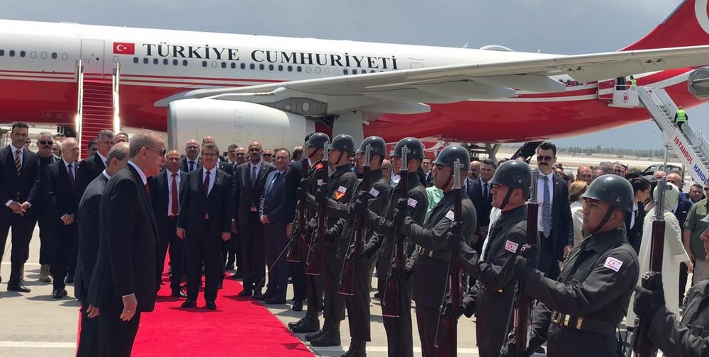 Εν μέσω δρακόντειων μέτρων ασφαλείας ο κ. Ερντογάν σταμάτησε στην είσοδο του παράνομου αεροδρομίου χαιρέτισε και συνομιλήσει με κόσμο που είχε συγκεντρωθεί από νωρίς εκεί για να τον υποδεχθεί κρατώντας πανό με συνθήματα όπως «Τρία κράτη, ένα έθνος», «Αγάπη μας η Γαλάζια Πατρίδα», καθώς και σημαίες της Τουρκίας, του ψευδοκράτους και του Αζερμπαϊτζάν, όπου θα μεταβεί αύριο ο Τούρκος Πρόεδρος.