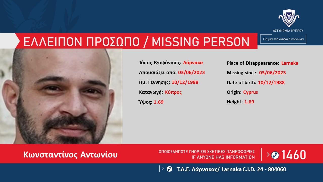 Η Αστυνομία ζητά πληροφορίες που μπορούν να βοηθήσουν στον εντοπισμό του Κωνσταντίνου Αντωνίου, 34 ετών, ο οποίος απουσιάζει από τις 03/06/2023, από την οικία του στη Λάρνακα.
