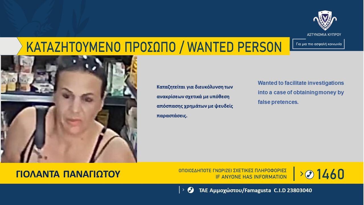 Πρόκειται για την Γιολάντα Παναγιώτου, 46 ετών. Παρακαλείται οποιοσδήποτε γνωρίζει οτιδήποτε που μπορεί να βοηθήσει στον εντοπισμό της, να επικοινωνήσει με το ΤΑΕ Αμμοχώστου, στο τηλέφωνο 23-803040 ή με τη Γραμμή του Πολίτη, στον τηλεφωνικό αριθμό 1460 ή με τον πλησιέστερο Αστυνομικό Σταθμό.