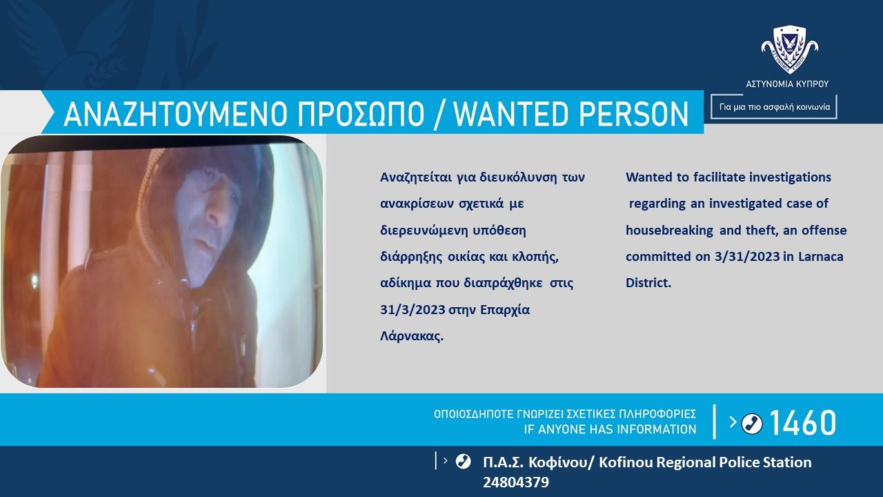 Η Αστυνομία ζητεί πληροφορίες για εντοπισμό προσώπου, η φωτογραφία του οποίου δημοσιεύεται, σχετικά με διερευνώμενη υπόθεση διάρρηξης κατοικίας και κλοπής, αδίκημα που διαπράχθηκε στις 31 Μαρτίου, 2023 στην επαρχία Λάρνακας.