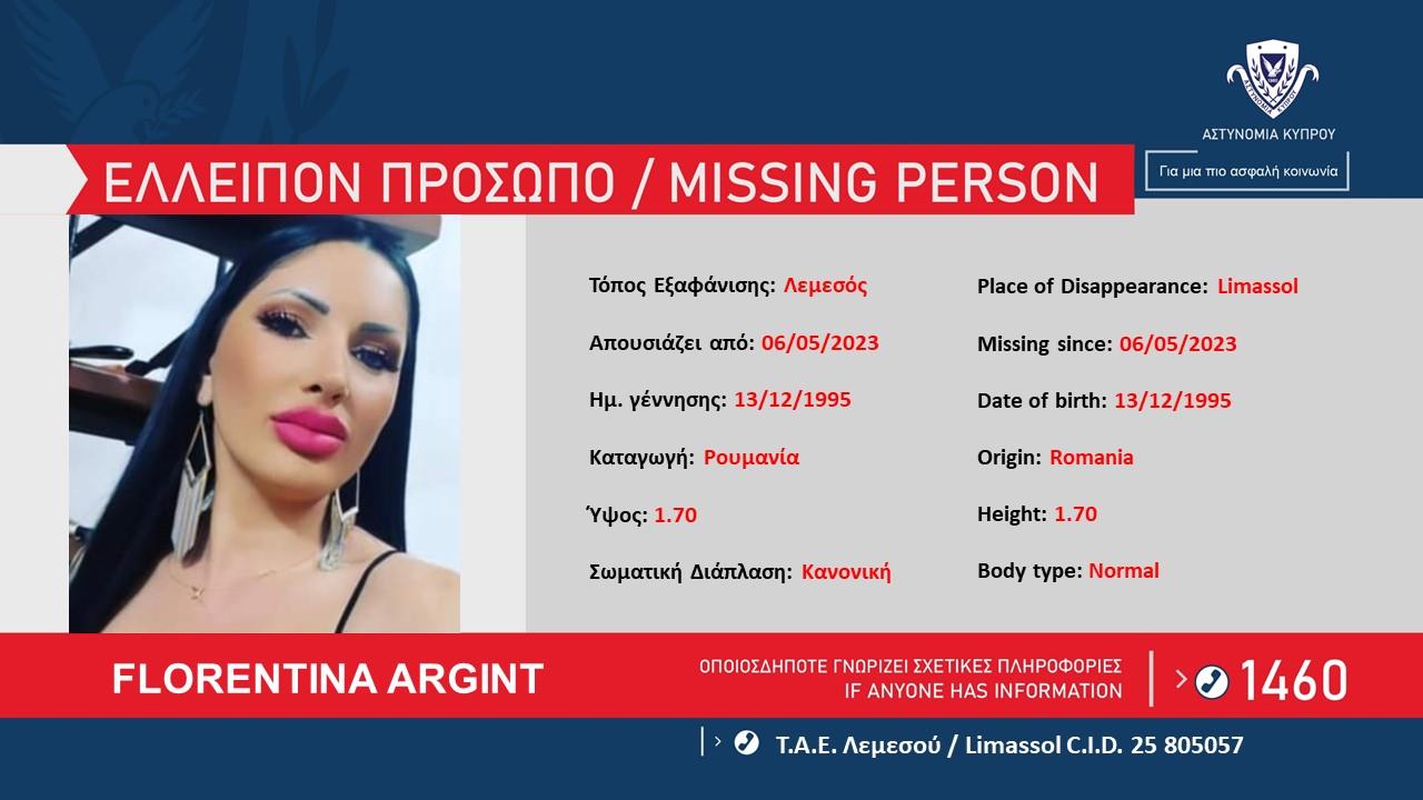 Η Αστυνομία ζητά πληροφορίες που μπορούν να βοηθήσουν στον εντοπισμό της FLORENTINA ARGINT, 27 ετών, από τη Ρουμανία, η οποία απουσιάζει από τις 6 Μαΐου, 2023 από την οικία της στη Λεμεσό.