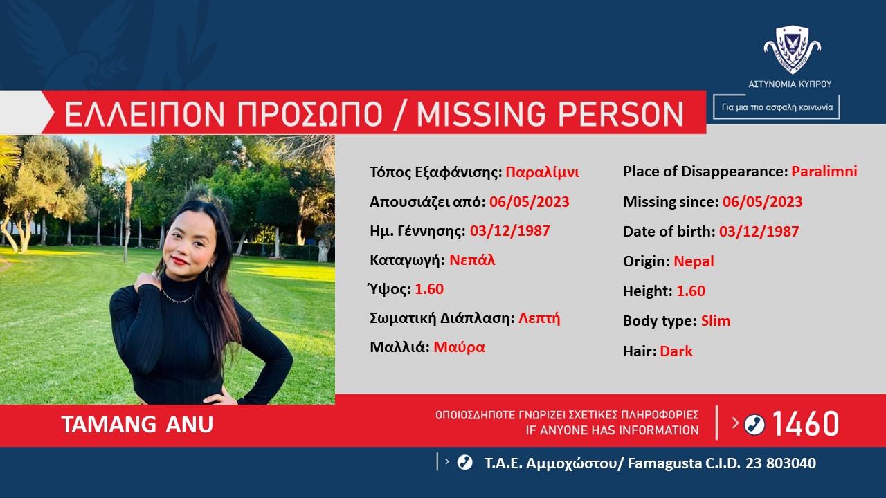 Η Αστυνομία ζητά πληροφορίες που μπορούν να βοηθήσουν στον εντοπισμό της TAMANG ANU, 35 ετών, από το Νεπάλ, η οποία απουσιάζει από το χώρο διαμονής της, στο Παραλίμνι, από τις 06/05/2023.